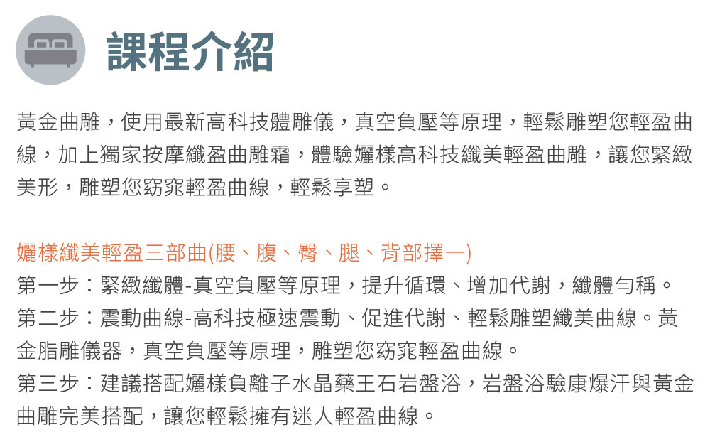 本券不分平假日可使用黃金輕盈曲雕課程(30 分鐘)。