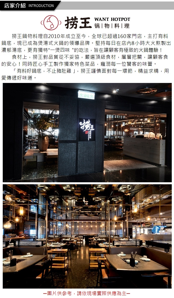 撈王鍋物料理自2010年成立至今,全球已超過160家門店,主打有料鍋底,現已成為煲湯式火鍋的領導品牌。堅持每日在店內8小時大火熬製出濃郁湯底,更有獨特”一煲四味“的吃法,旨在讓顧客有極致的火鍋體驗!