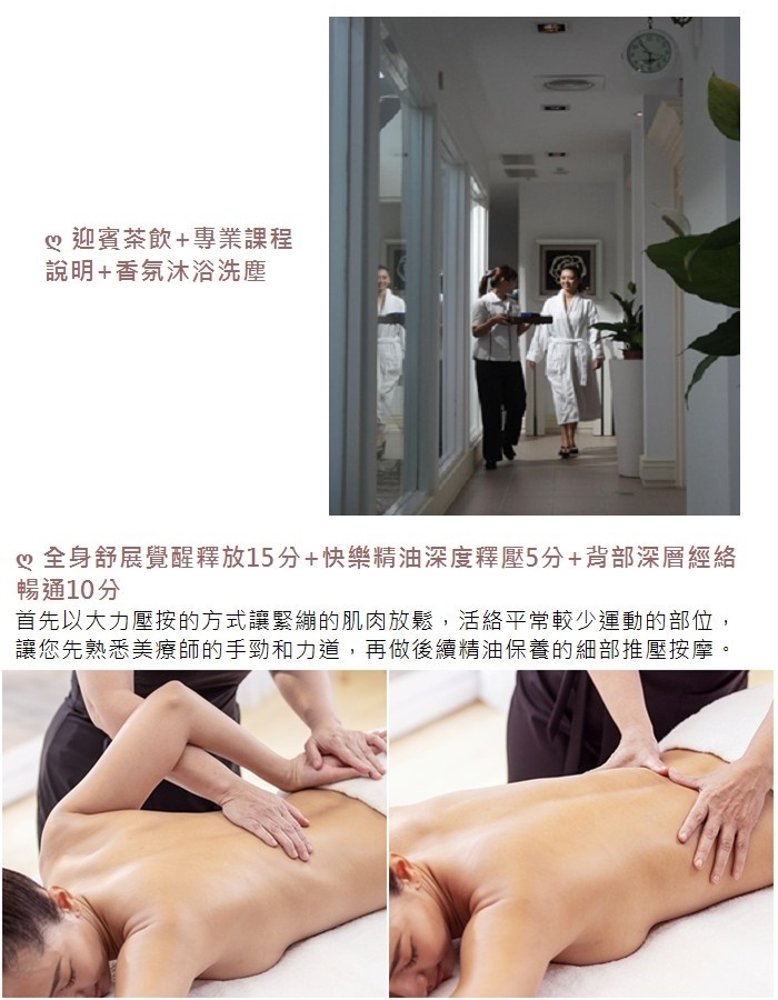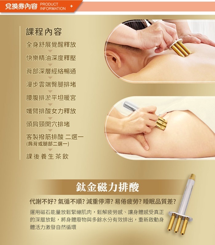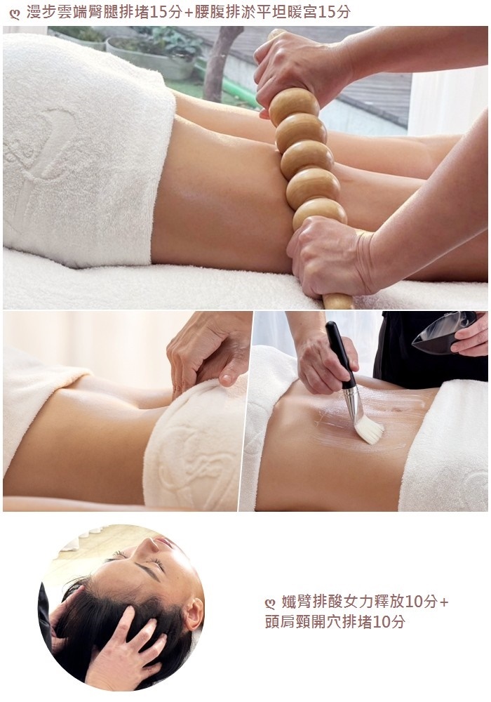 2.課程內容: 全身舒展覺醒釋放+快樂精油深度釋壓+背部深層經絡暢通+漫步雲端臀腿排堵+腰腹排淤平坦暖宮+孅臂排酸女力釋放+頭肩頸開穴排堵+撥筋排酸(背或腿2擇1)+ 課後茶飲。