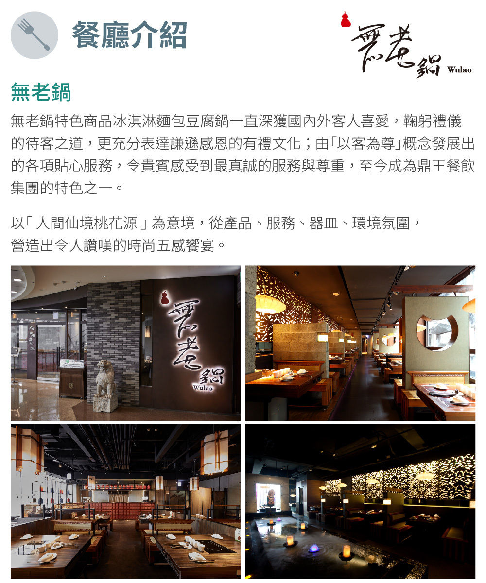 無老鍋特色商品冰淇淋麵包豆腐鍋一直深獲國內外客人喜愛,鞠躬禮儀的待客之道,更充分表達中國人遜感恩的有文化由「以客為尊」概念發展出的各項貼心服務,令貴賓感受到最真誠的服務與尊重,至今成為鼎王餐飲集團的特色之一。
