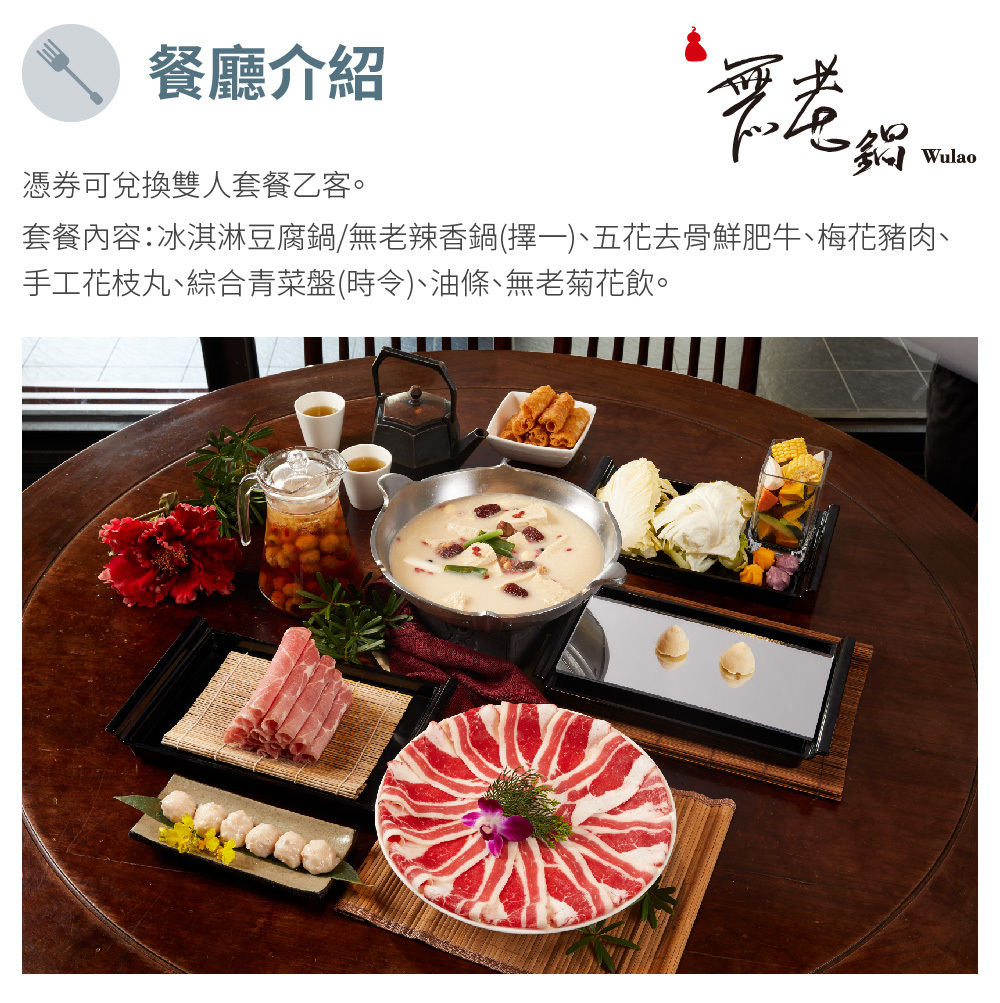 憑券可兌換雙人套餐乙客。 套餐內容:冰淇淋豆腐鍋/無老辣香鍋(擇一)、五花去骨鮮肥牛、梅花豬肉、手工花枝丸、綜合青菜盤(時令)、油條、無老菊花飲。