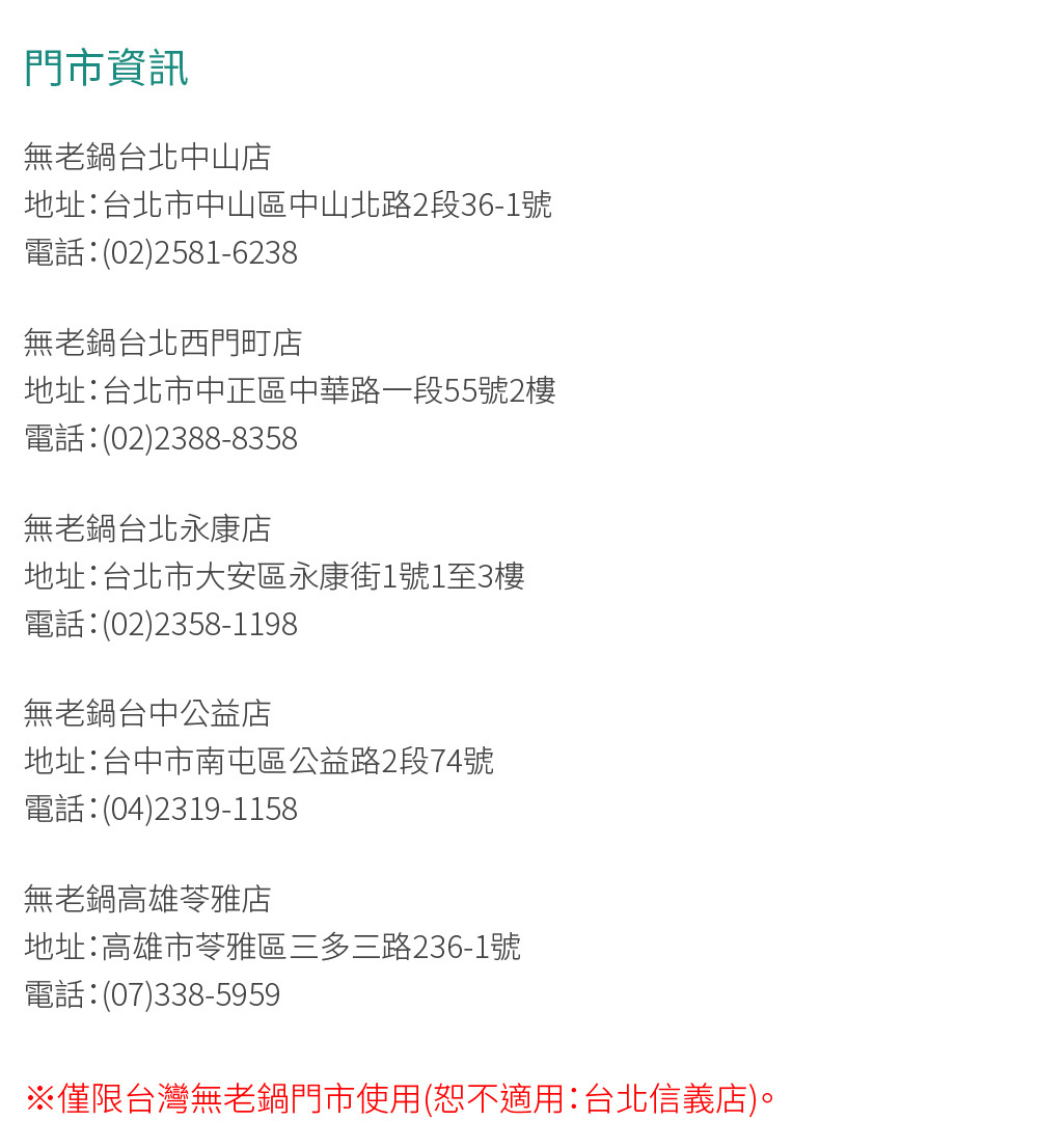 1.適用於台灣無老鍋各分店(恕不適用:台北信義店),應事先電洽門店並告知持有此券,到店取餐時請先出示本券由服務人員現場核銷。