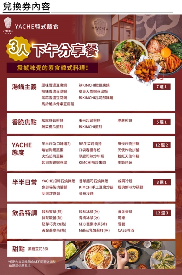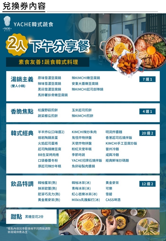 ◎香脆焦點(4選1): 1.松露野菇煎餅2.蔬菜櫛瓜煎餅3.玉米起司煎餅4.辣KIMCHI煎餅 ◎韓式經典(20選2): 1.半半炸G(口味選2)2.熔岩陶鍋蒸蛋3.火焰起司蛋捲4.起司陶鍋嫩豆腐5.BB生菜烤肉捲6.口袋春醬冬粉7.厚起司辣炒年糕8.KIMCHI辣炒朱肉9.鬼怪炸物拼盤10.天使炸物拼盤11.粉紅天使年糕12.季節時蔬13.YACHE招牌石燒拌飯14.魚卵秘製肉醬鍋15.明洞炸醬麵16.香蔥起司石燒拌飯17.KIMCHI手工豆腐炒飯18.晉州冷麵19.咸興冷麵20.經典鮮味炒碼麵