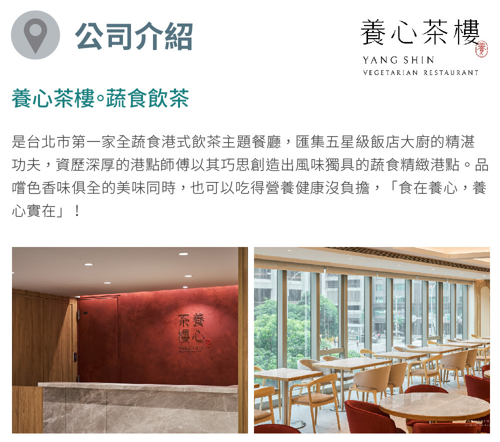 二○一三年,養心茶樓拋棄素食既有的口味與模樣,結合港式飲茶,成為台北第 一家蔬食飲茶。