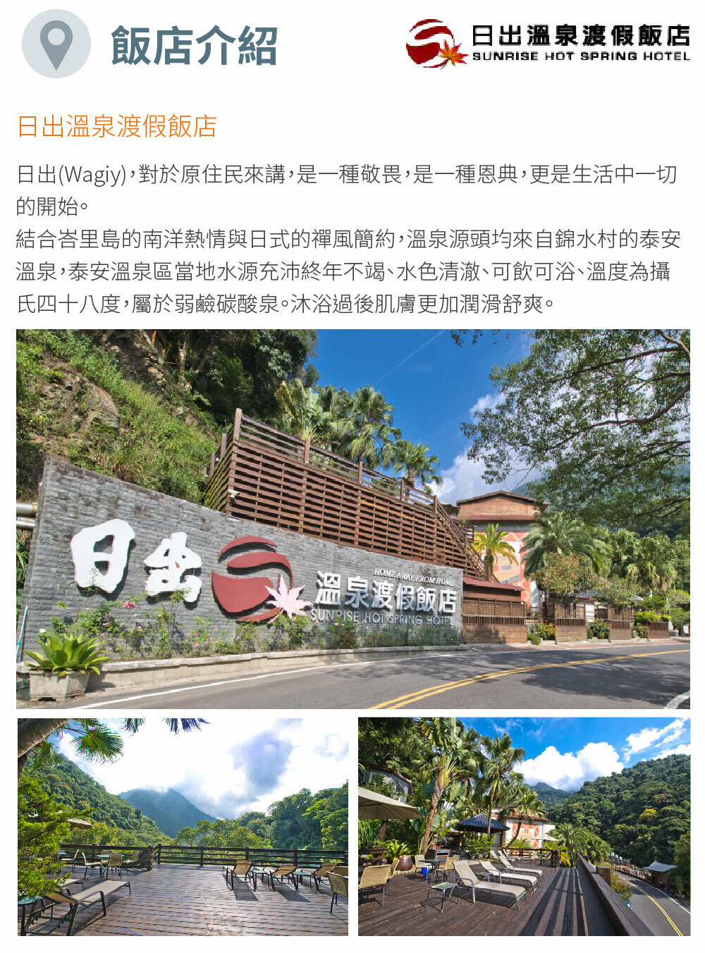 6.使用票券須事先致電「日出溫泉渡假飯店」預約,連絡電話:(03)794-1988。