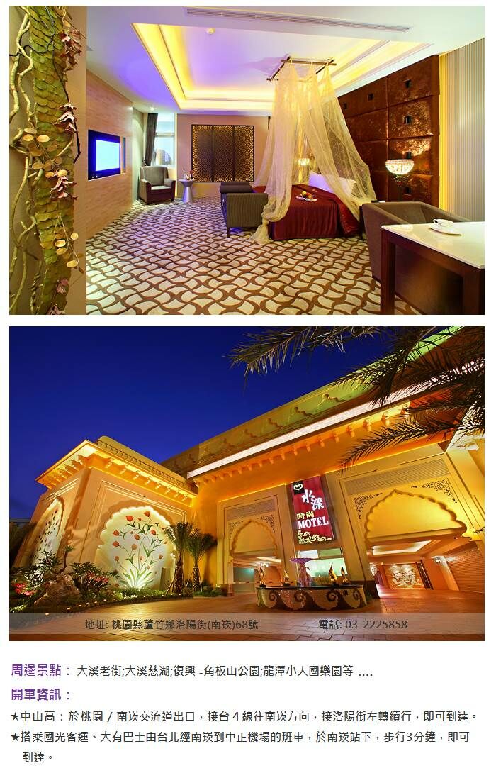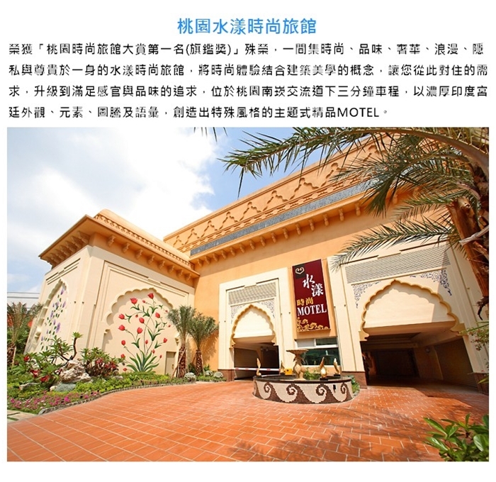榮獲「桃園時尚旅館大賞第一名(旗鑑獎)」殊榮,一間集時尚、品味、奢華、浪漫、隱私與尊貴於一身的水漾時尚旅館,將時尚體驗結合建築美學的概念,讓您從此對住的需求,升級到滿足感官與品味的追求,位於桃園南崁交流道下三分鐘車程,以濃厚印度宮廷外觀、元素、圖騰及語彙,創造出特殊風格的主題式精品MOTEL。