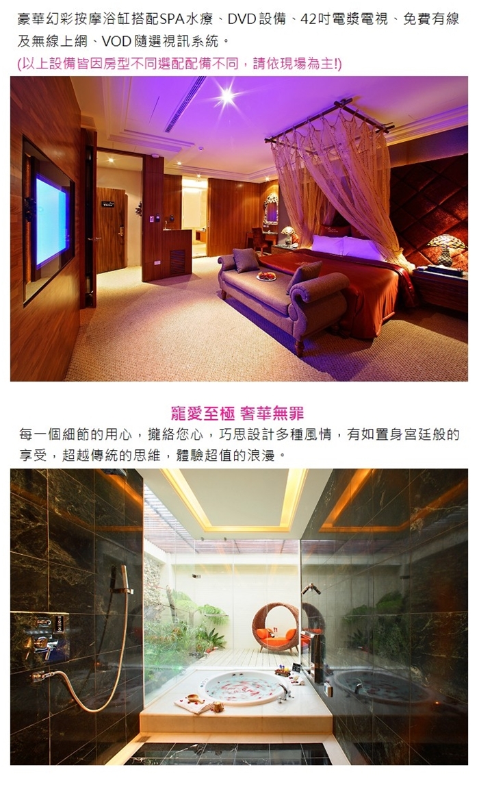 每一個細節的用心,攏絡您心,巧思設計多種風情,有如置身宮廷般的享受,超越傳統的思維,體驗超值的浪漫。豪華幻彩按摩浴缸搭配SPA水療、維琪浴、氣泡床、烤箱、VOD、KTV、DVD、50吋電漿電視、100吋投影電視、OSIM按摩椅、Wii遊戲機、VOD隨選視訊系統等多樣主題設施。