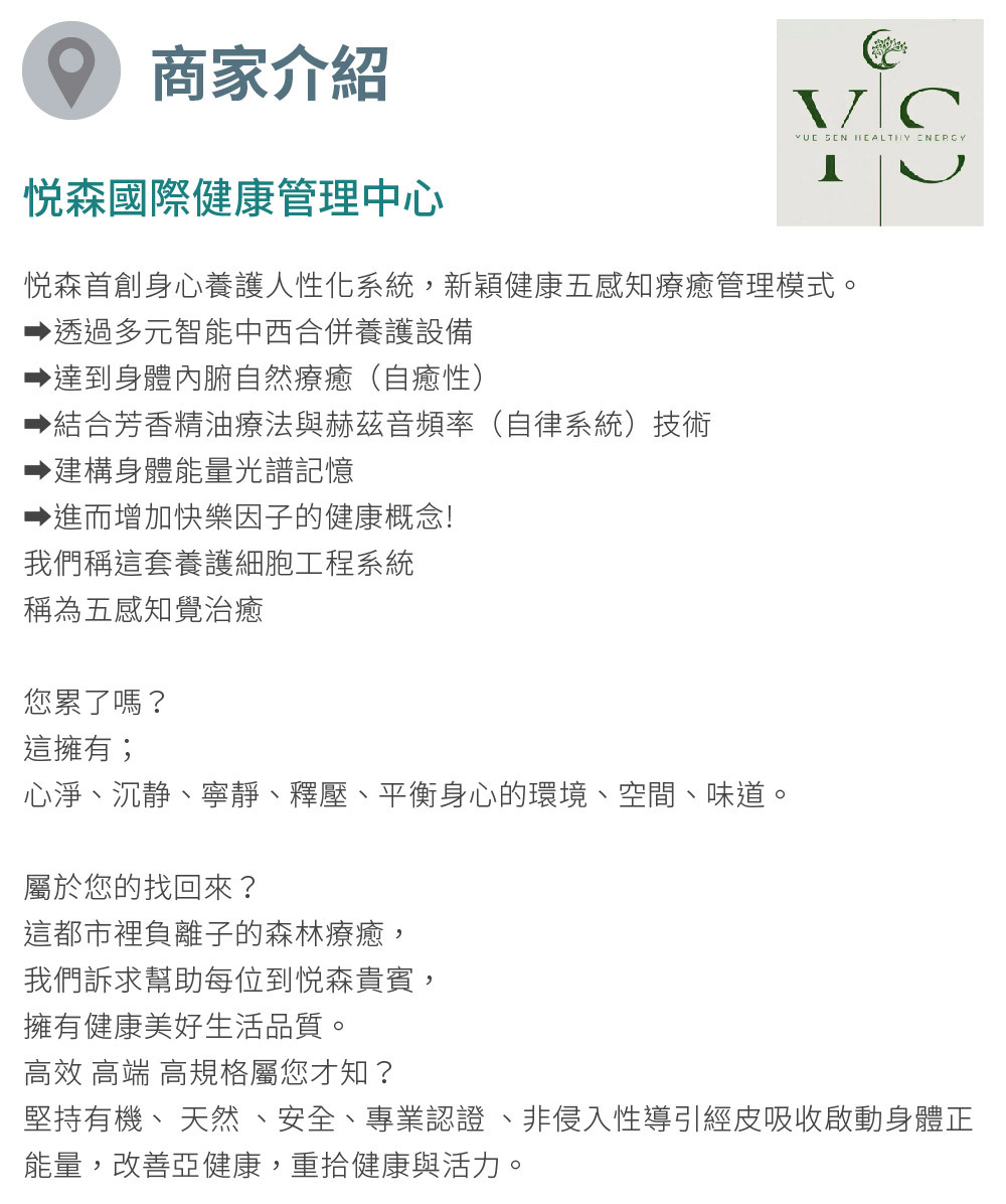 4. 本券適用店別為:【悦森國際健康管理中心】中壢中豐湧泉店