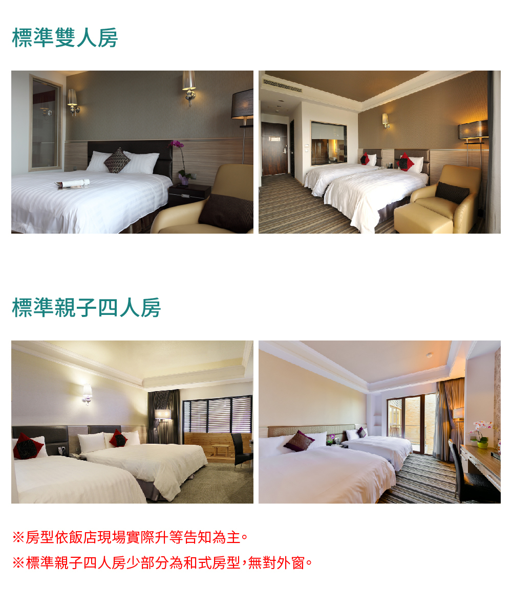 1. 此專案享免費升等標準4人房(第三、四人早餐可現場加購,房型依飯店安排為主,恕無法指定)。