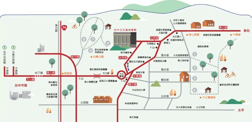 『台中日光溫泉會館』耗資台幣六億元精心打造佔地一萬四千坪的精品溫泉會館,坐落於素有台中陽明山之稱的大坑風景區內,有著陽光灑落、月光斜照的溫泉會館,我們將它取名為-日光。館內設有52間豪華客房,38間精美湯屋,會館周邊共有九條登山步道與風景區內源源不絕的觀光資源,鄰接新社地區各種庭園咖啡廳、東勢綠色走廊、卓蘭客家小吃、大湖觀光草莓園等各式觀光景點。而大坑風景區正處於這些景點的中心位置點,再加上天然溫泉資源與風光明媚的自然景觀,距離台中市市區不到三十分鐘車程的大坑風景區,是您暢遊中台灣最佳選擇。