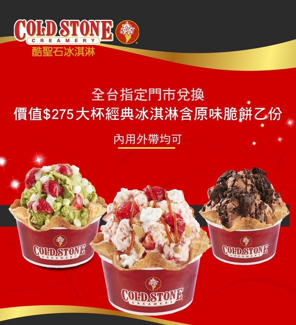 1.單張可於酷聖石冰淇淋全台直營門市兌換價值$275大杯經典冰淇淋含原味脆餅乙份(內用外帶均可),如欲兌換價格高於$275或兌換時價格調漲,請依實際訂價補價差。