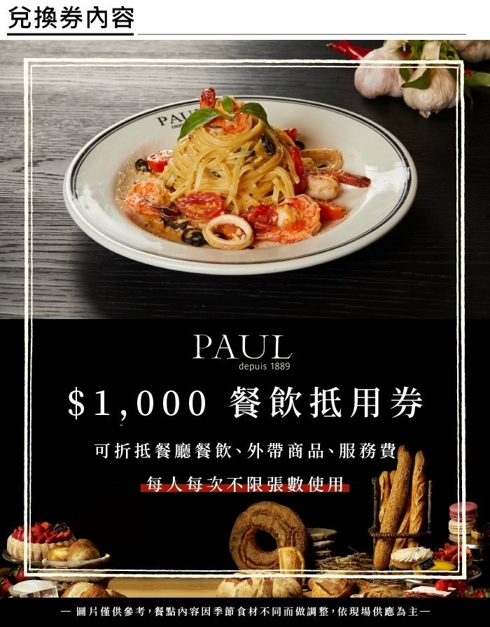 1.$1000餐飲抵用券限於《PAUL法國麵包甜點沙龍》內用或外帶,每人每次不限張數使用,抵用券優惠內容可折抵餐廳餐飲、外帶商品、服務費$1000,若餐飲服務總價值超過$1000,需於現場補價差使用額外服務。(優惠券金額不另開發票,若有補差額將另開發票)。