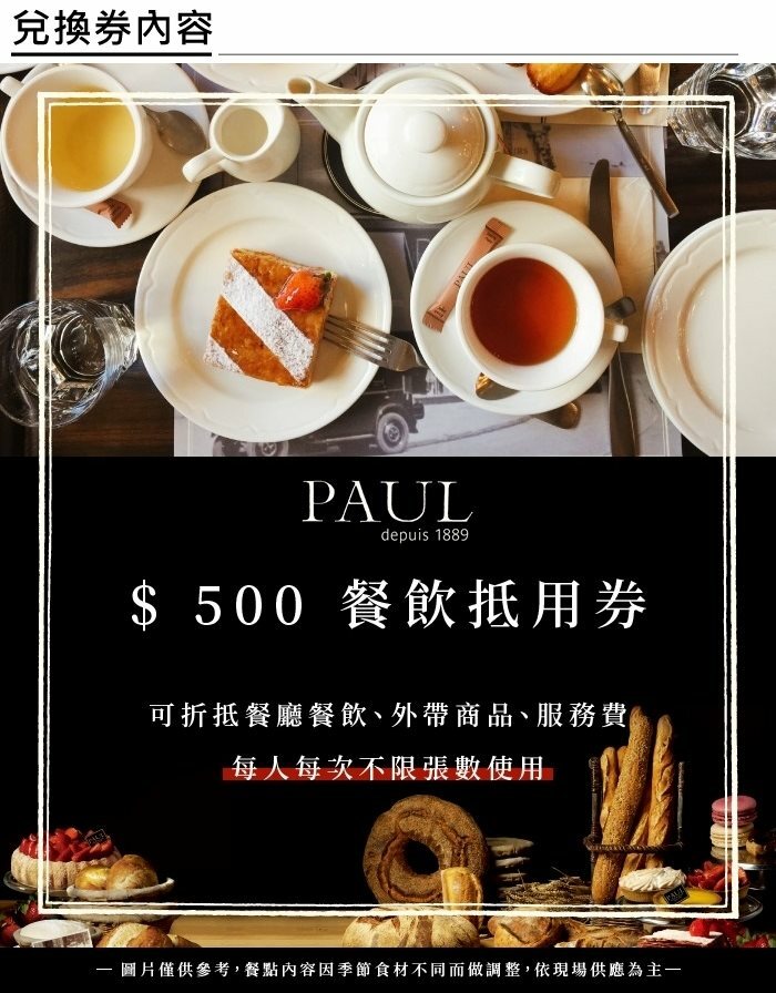 2.$500餐飲抵用券限於《PAUL法國麵包甜點沙龍》內用或外帶,每人每次不限張數使用,抵用券優惠內容可折抵餐廳餐飲、外帶商品、服務費$500,若餐飲服務總價值超過$500,需於現場補價差使用額外服務。(優惠券金額不另開發票,若有補差額將另開發票)。