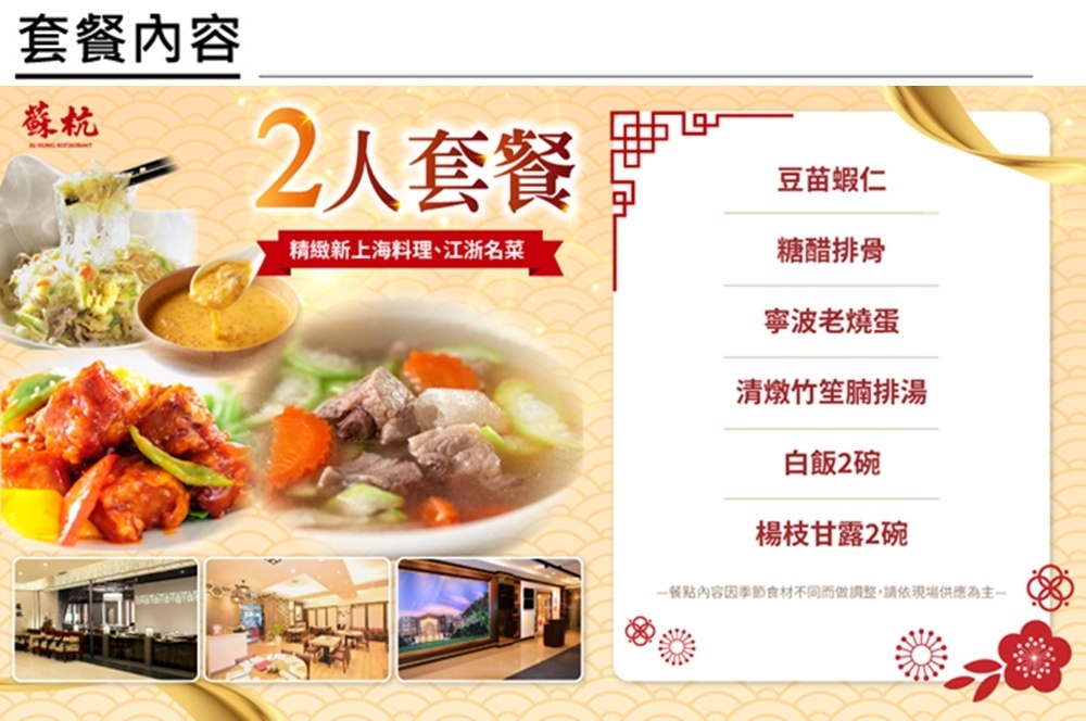 單張券可2人於蘇杭餐廳適用分店享用雙人套餐。(已含服務費)餐點內容:豆苗蝦仁+糖醋排骨+寧波老燒蛋+清燉竹笙腩排湯+白飯2碗+楊枝甘露2碗。★以上餐點內容因季節食材不同而做調整,依現場供應為主。