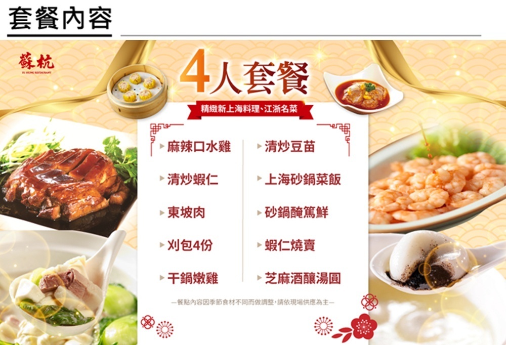 單張券可4人於蘇杭餐廳適用分店享用四人套餐。(已含服務費)餐點內容:麻辣口水雞+清炒蝦仁+東坡肉+刈包4份+干鍋嫩雞+清炒豆苗+上海砂鍋菜飯+砂鍋醃篤鮮+蝦仁燒賣+芝麻酒釀湯圓。