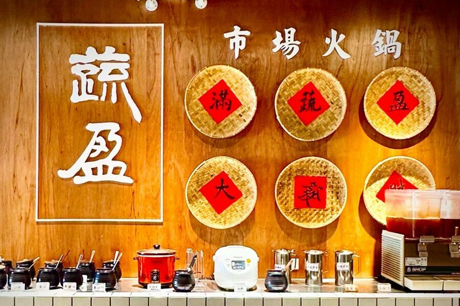 蔬盈市場火鍋,「宛如菜市場」的復古店面格外吸睛。最特別的是,蔬盈市場火鍋以「健康」為訴求,自助餐檯供應約40種新鮮蔬菜/雞蛋/豆製品/飯麵,主打每人300元蔬食吃到飽。