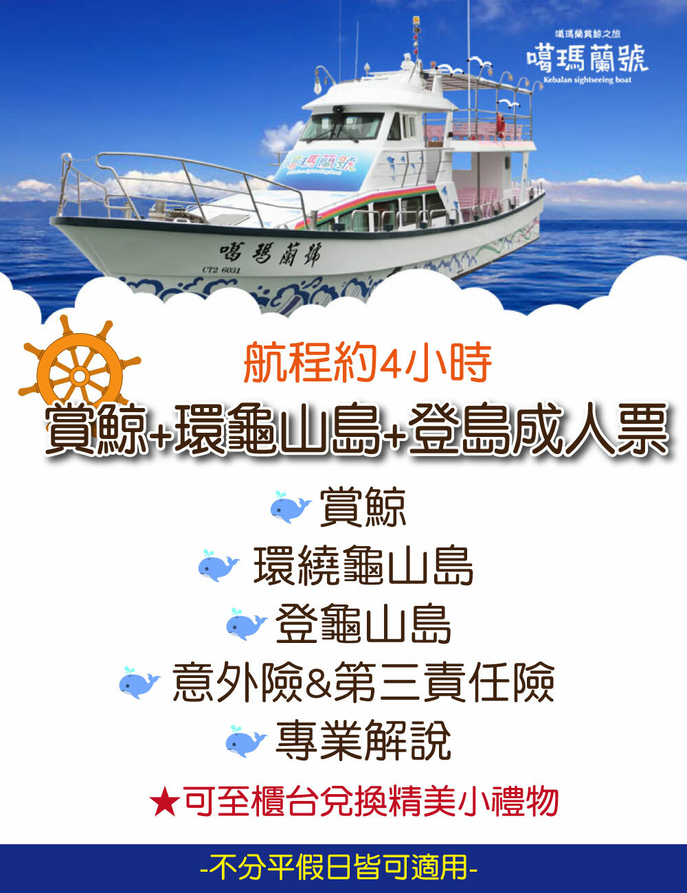 1. 本券可單人搭乘噶瑪蘭號賞鯨船(或同業賞鯨船),航程約4小時,內含賞鯨+環繞龜山島+登龜山島+意外險+第三責任險+專業解說乙次,並可至櫃台兌換精美小禮物。(每人每次限用乙張,恕無法與他人併用)