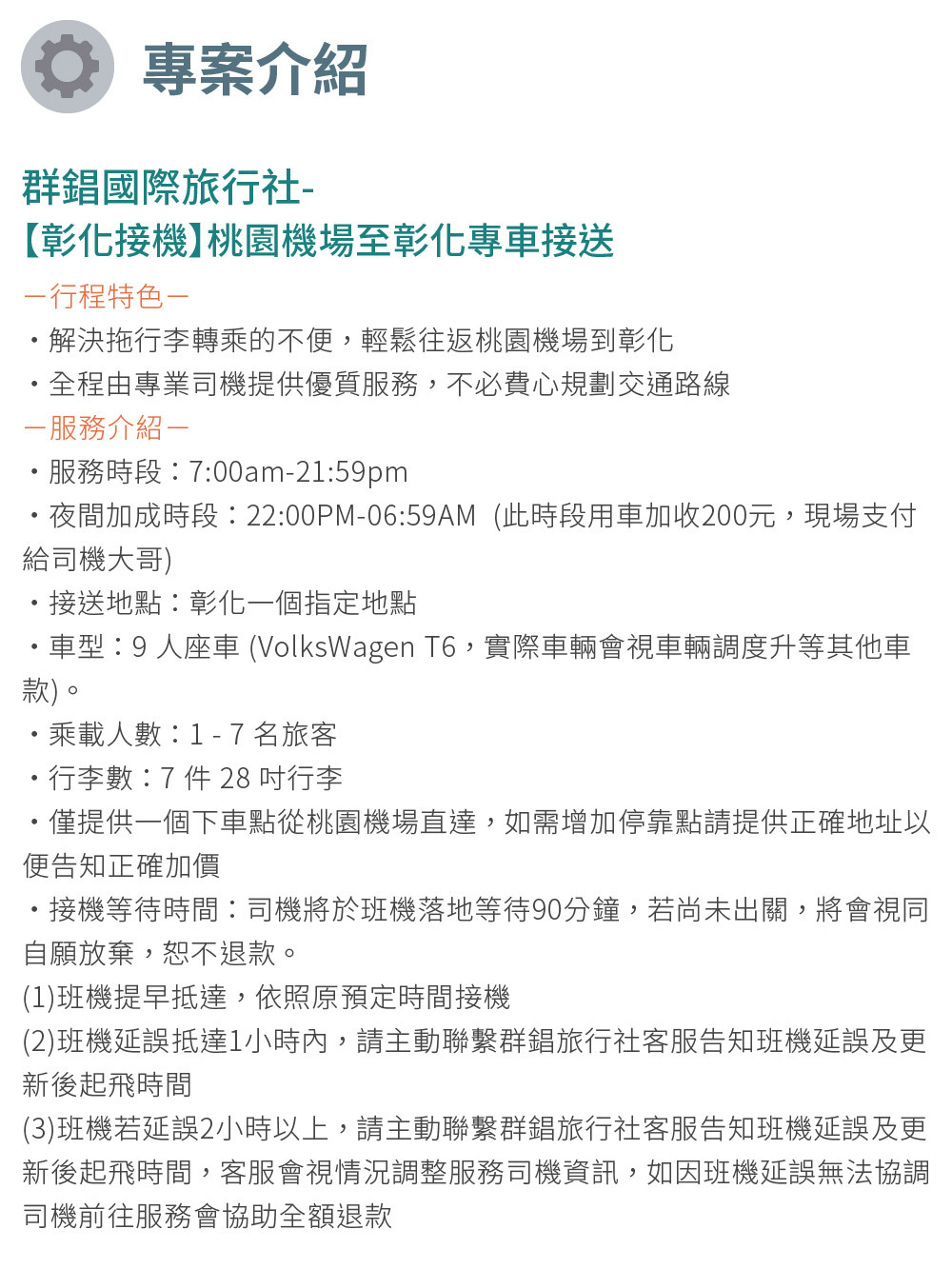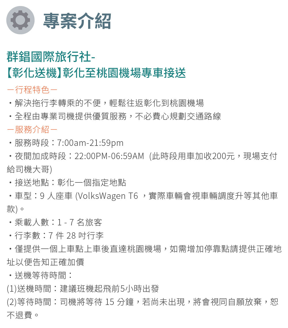 5. 過年期間加價說明:過年期間(114/1/25-114/2/3)加收費用1000 (現場支付給司機大哥) ・項目加價說明:台灣法律規定5歲(含)以下孩童需使用增高墊或安全座椅,租借費用$200/張,請於預約用車時告知,如拒絕乘坐及租借,司機有權拒載旅客且不退費。(現場支付給司機大哥)