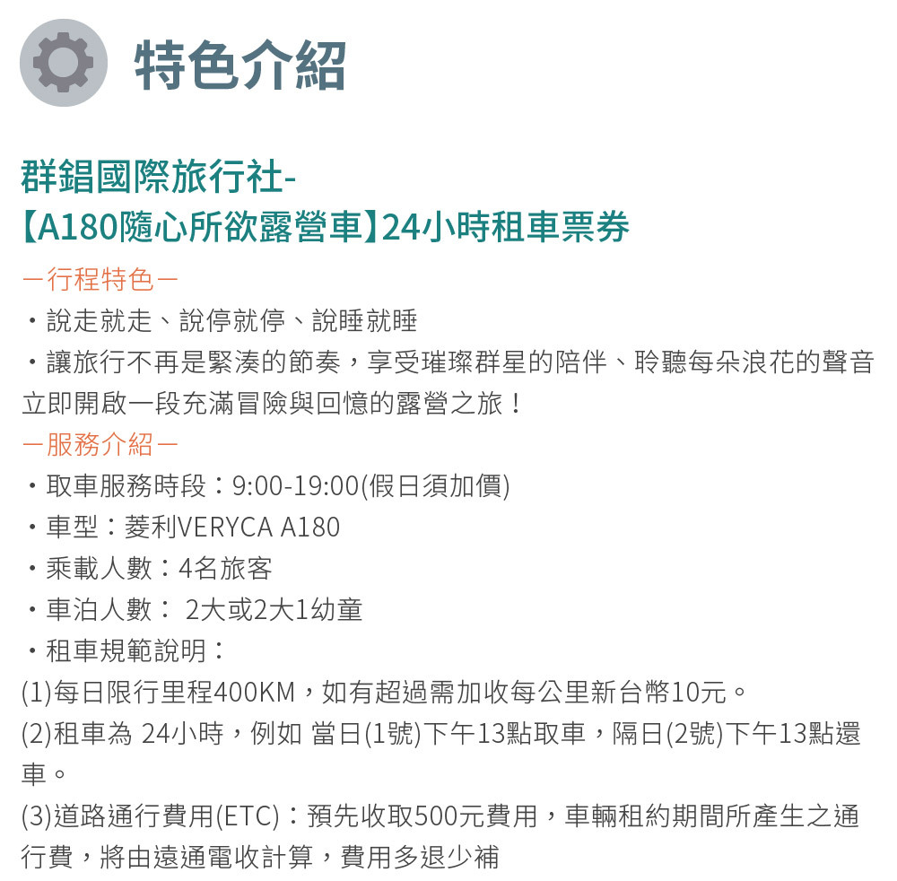 8.票券使用說明: 此票券為兩天一夜租車為 24小時, 如需要三天兩夜,請購買2張票券以此類推