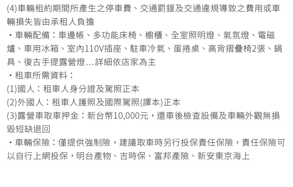 5.租車超時費用說明:每小時$400元,超過6小時則視同為一日,現場收取平日費用$3980元假日收取$4380元