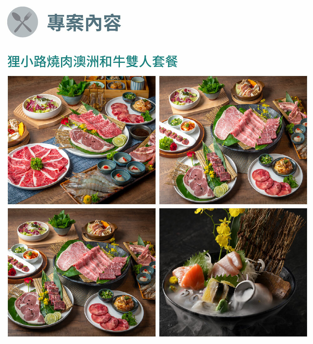 1.票券兌換內容:狸小路燒肉澳洲和牛雙人套餐