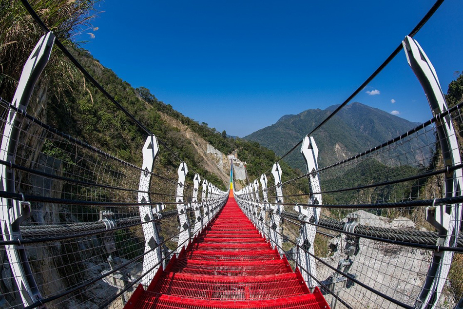 素有「天空之橋故鄉」美譽的南投縣,吊橋全長342公尺、離河谷深達110公尺,相當於30層樓高度,號稱全台最美最長最深又刺激的景觀吊橋,懸吊在懸岩峭壁上,遠眺雙龍瀑布、俯瞰美麗溪谷,景色壯麗迷人。