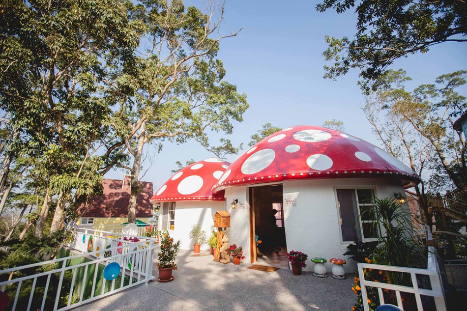 蘇維拉莊園隱身在山林中,四周被群山圍繞,一進園區就可以看見超可愛的蘑菇屋,就像瞬間掉入愛麗絲的世界般夢幻!