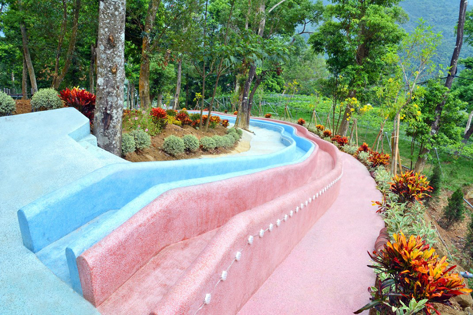 蘇維拉莊園裡除了好拍好逛的建築佈置外,絕對不能錯過全台最長的抿石子溜滑梯!除了顏色超粉嫩、超可愛,從全長75公尺的溜滑梯滑下來,讓人一秒回到童年的快樂!