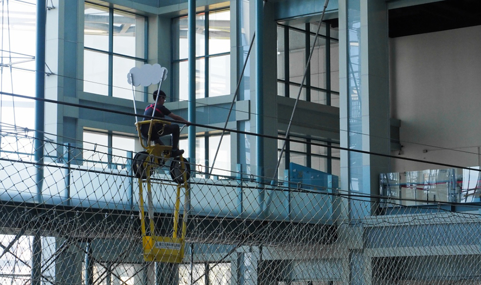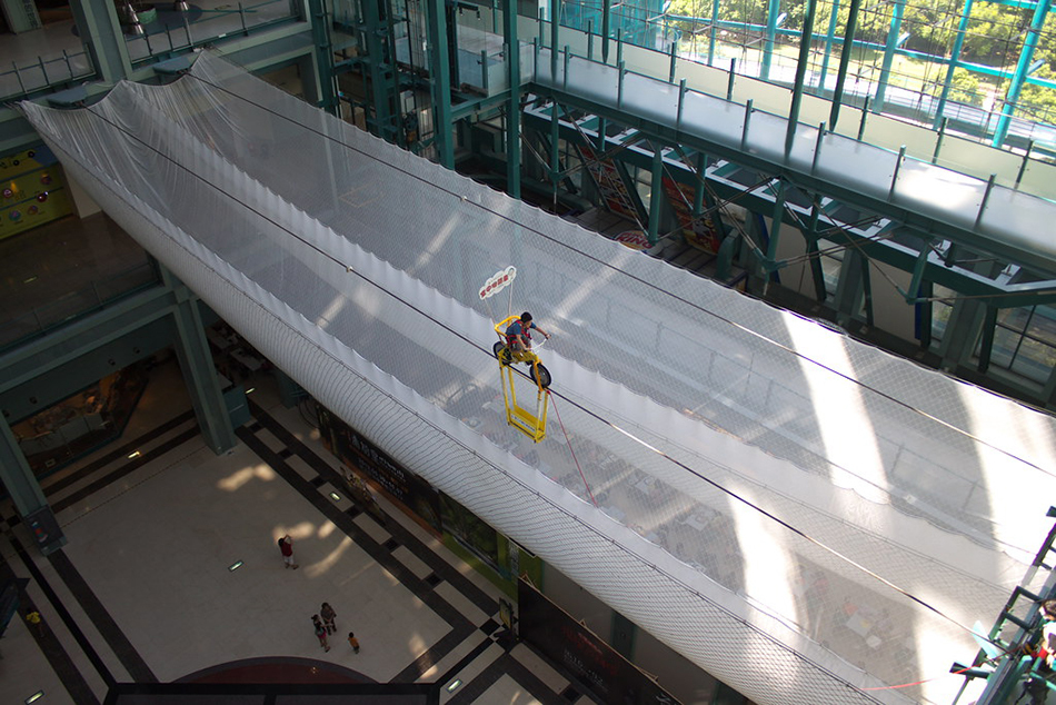 互動式空間腳踏車,架設於離地五樓高,展現平衡力原理,成人和孩子們藉由騎乘腳踏車過程中,可親自體驗相對平衡和重力中心原理。