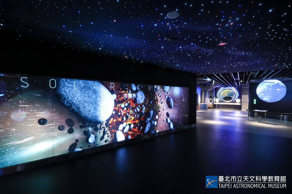 展示場分為:序曲、地球、太空探險、日地月、太陽系、恆星世界、銀河系、兒童區、星系、宇宙、外星生命的探索、天文觀測-發現星光的祕密、什麼是重力波及臺灣參與的國際天文研究,利用各展區,對宇宙中的奧祕,作深入巡禮,讓我們一同悠遊星海,領略天文之美。
