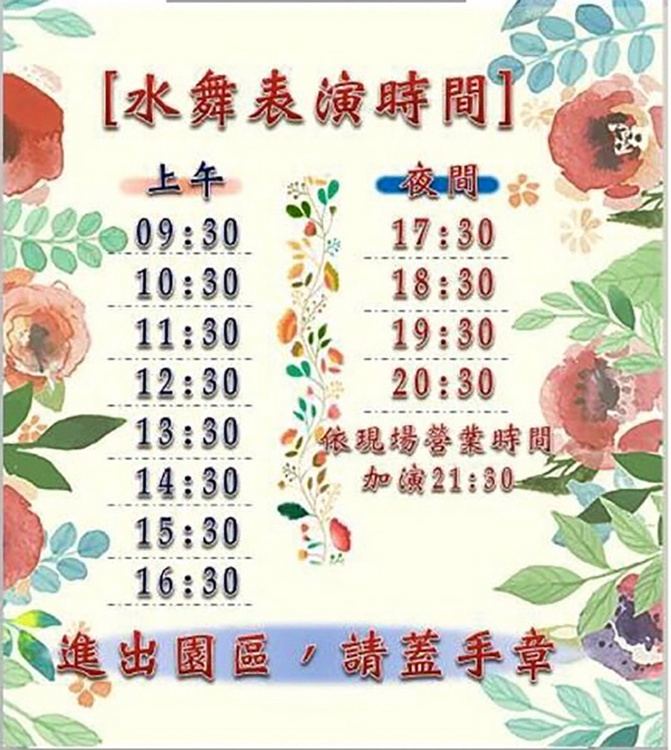 ※小瑞士花園內每日有定時水舞表演,若於當日營業時間內,需要重複進出園區,請於出入口處向服務人員蓋上手章,方能再次入園。