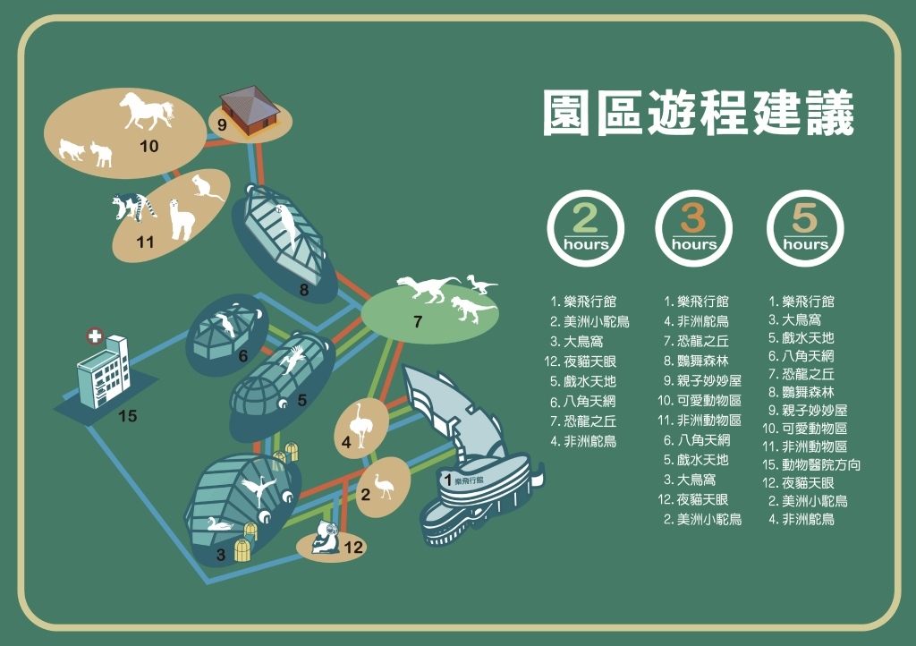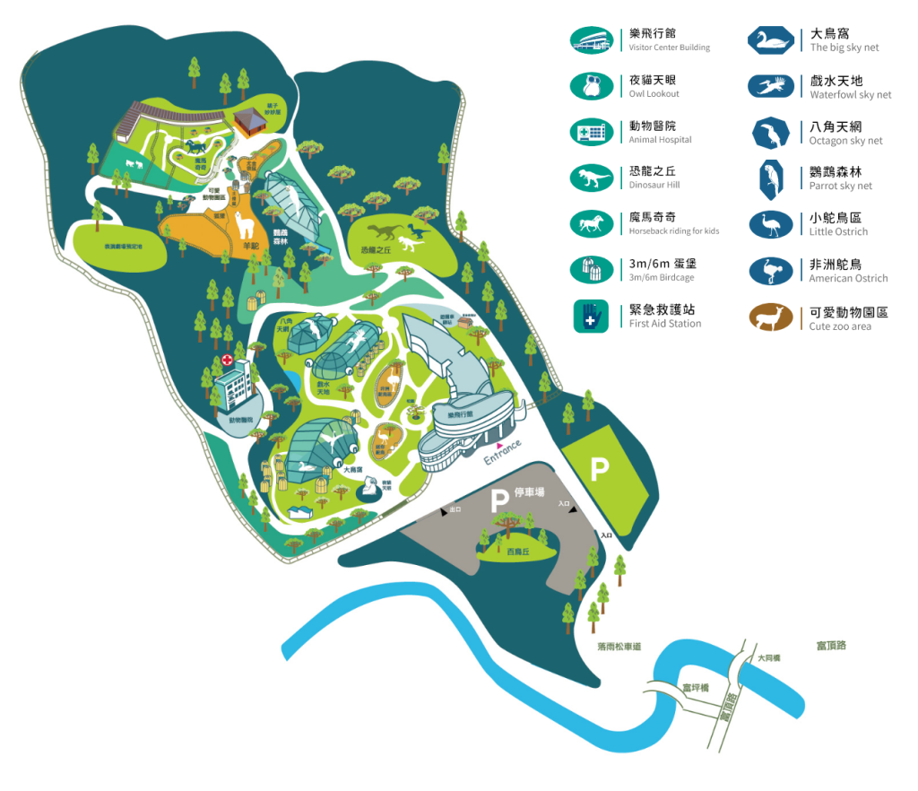 園區內,目前有數十種的珍奇鳥類以及許多迷你可愛的動物,此外還有動態恐龍模型提供觀賞。園區內亦有規劃多項特色餐飲,提供遊客耳目一新的觀光體驗!還有導覽員親切細心的生態介紹,也能和鳥兒們一起走動,體驗與珍貴物種的近距離接觸。