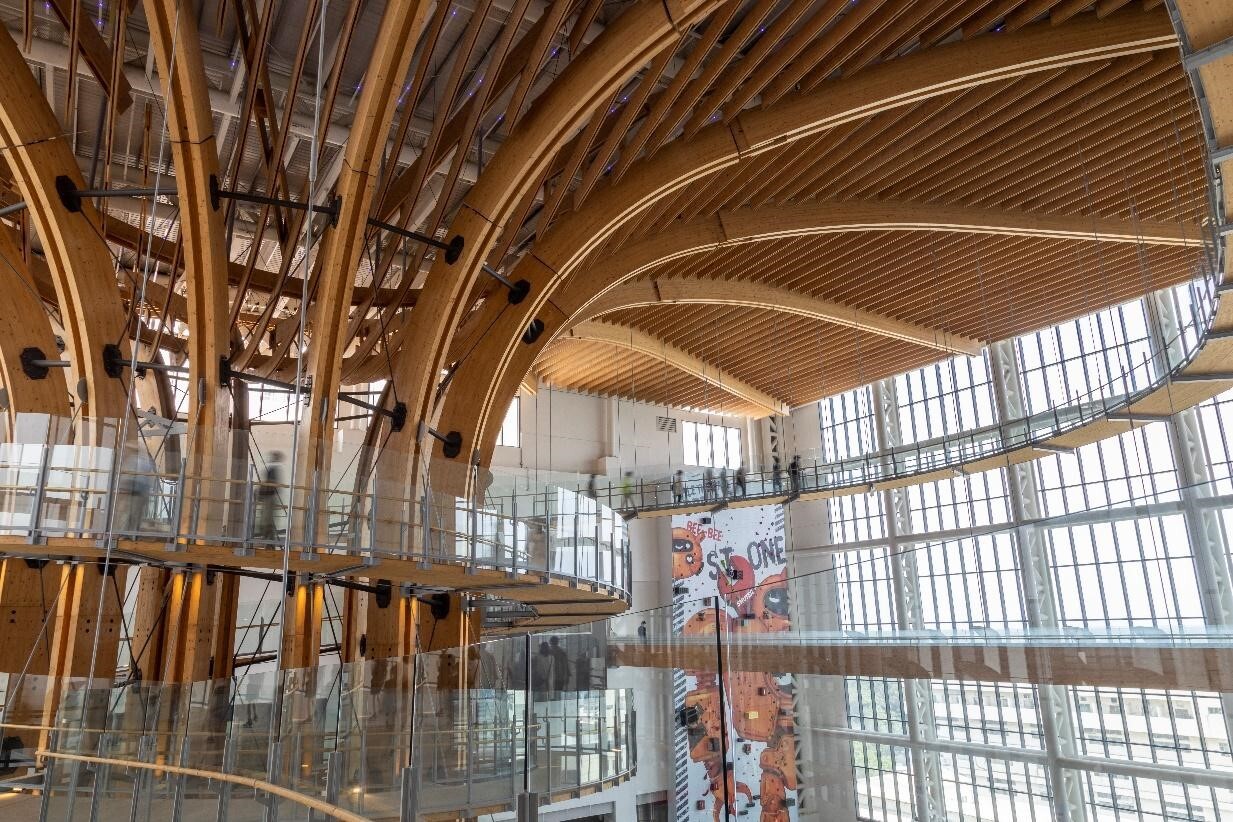 最吸引人的莫過於這顆「阿凡達生命樹」了!使用奧地利雲杉作為材料,流暢而有機的線條展現「Tree of life」阿凡達生命樹的力量與強度。此生命樹足足有 30.8 公尺,相當於十層樓高,支撐整座屋頂,沿著長達 386 公尺的環樹步道緩步而下,一旁的落地窗使得採光十分充足,還可以遠眺中央山脈。