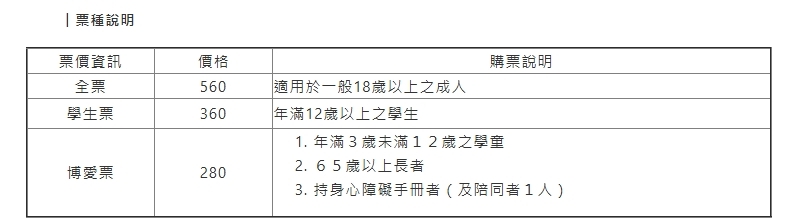 此門票分為全票、優待票兩種,其他票種請至現場洽詢。