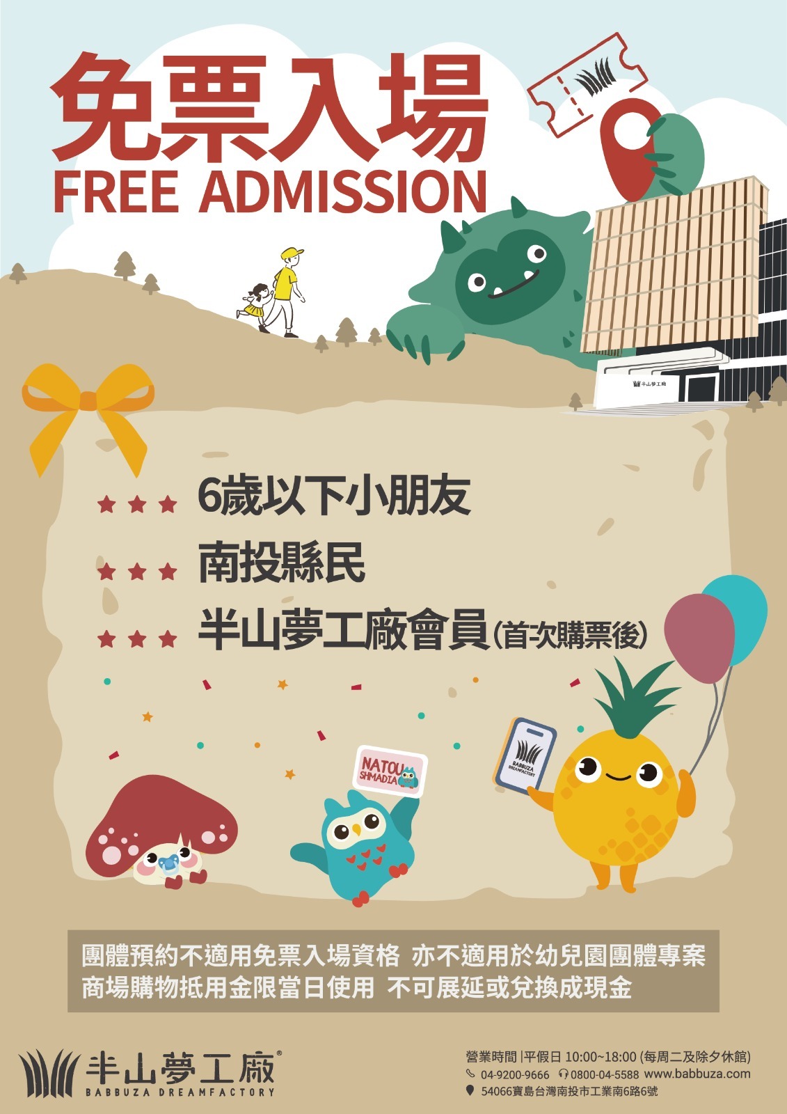免票入場資訊 (須出示證件):6歲以下小朋友、南投縣民、半山夢工廠會員(首次購票後) 考量天候關係,建議出發前請確認臉書或官網資訊。