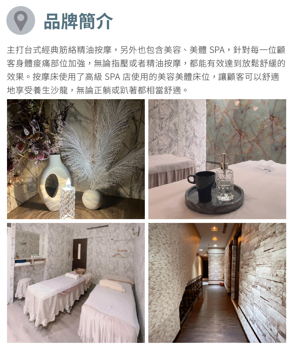 參陸玖SPA館主打台式經典筋絡精油按摩,另外也包含美容、美體 SPA,針對每一位顧客身體痠痛欲改善的部位加強,無論指壓或者精油按摩,都能有效達到放鬆舒緩的效果。