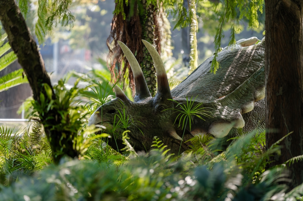 ▲ 戶外區域隱身在樹林中的恐龍展示,讓人恍如置身於真實版的侏儸紀公園。