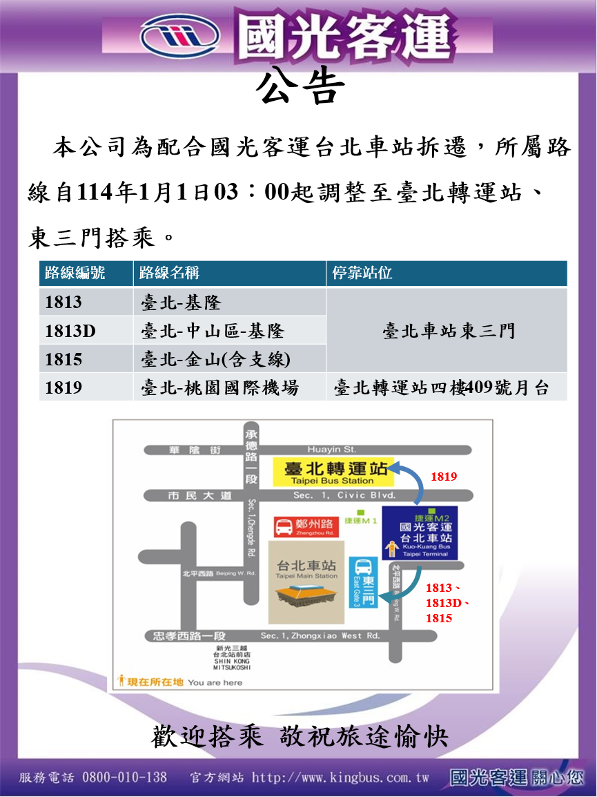 自2025/01/01起變更乘車及兌換地點至台北轉運站4樓409號月台前國光客運櫃台