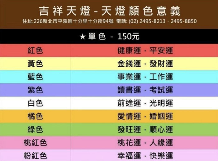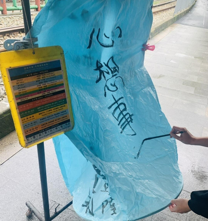 在吉祥天燈施放天燈,一開始先挑選最適合自己的天燈顏色,店內人員會將天燈放置在一個可供書寫的架上,讓您在天燈上書寫心願以及對自己未來的期許,在書寫的過程中,我們可以看到平溪線火車從面前經過逛大街,看著冉冉升起的天燈在天空,祈許願望實現、心想事成,擁有滿滿的感動。