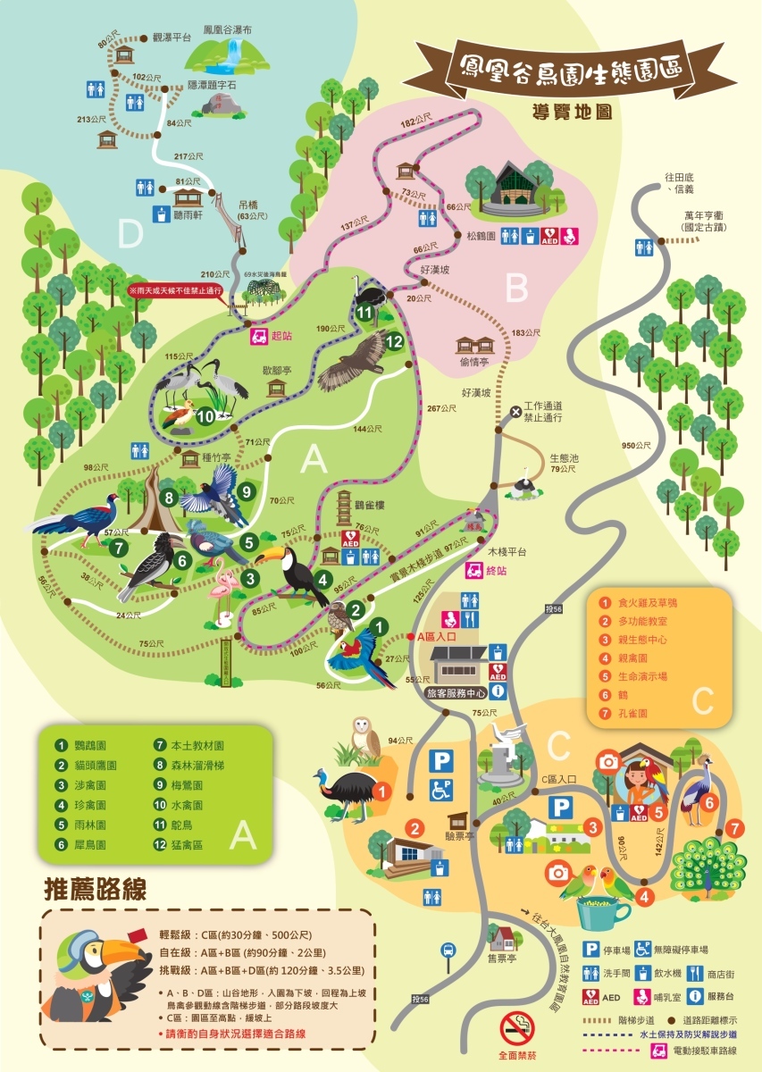 A區-世界各地珍貴鳥禽、鸚鵡園、貓頭鷹園、森林溜滑梯、走入式鳥籠、水土保持及防災解說步道。