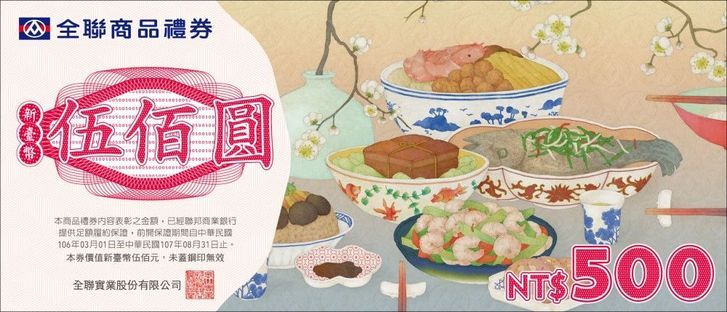 樣式以台灣曙鳳蝶、台灣琉璃紋鳳蝶、台灣藍鵲、台灣藍腹鷴等台灣最稀少、珍貴之保護動物為主軸,並代表了全聯福利中心禮券珍貴,不論是年節送禮、犒賞員工、饋贈親友,自用送禮兩相宜。
