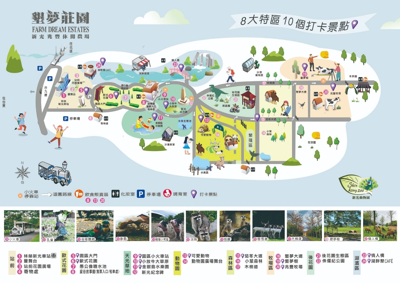 水牛大草原.新光紀念碑.後花咖花海區.登輝大道.環潭步道 (四秀湖、情人橋.兒童遊戲區.侏儸紀公園.鳥園區.可愛動物區.乳牛區,多樣景色等你發現