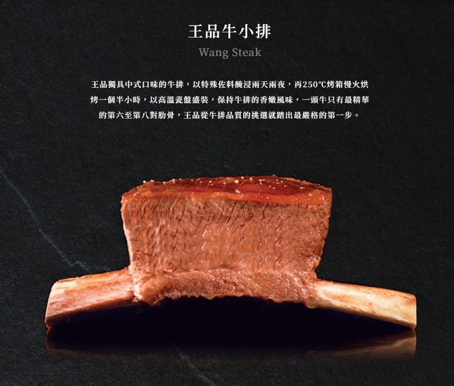 王品為了烹調出這道獨具中國口味的牛排,以特殊中國口味佐料醃浸兩天兩夜,將完全入味的帶骨牛小排,慢火燒烤一個半小時,再以高溫瓷盤盛裝,以保持牛排的香嫩風味,使全熟的牛排雖不帶血絲,卻異常鮮嫩,咬勁十足。王品歷經數千小時的嚴格選材、精心研發之後,發現一頭牛只有最精華的第六至第八對肋骨,得以使『王品牛排』的精髓脫穎而出,是全國唯一能在250℃烤箱烘烤一個半小時,還能保持100% 鮮嫩度的牛排。為了讓貴賓們能享受到如此珍貴的王品牛排,王品從牛排品質的挑選就踏出最嚴格的第一步。