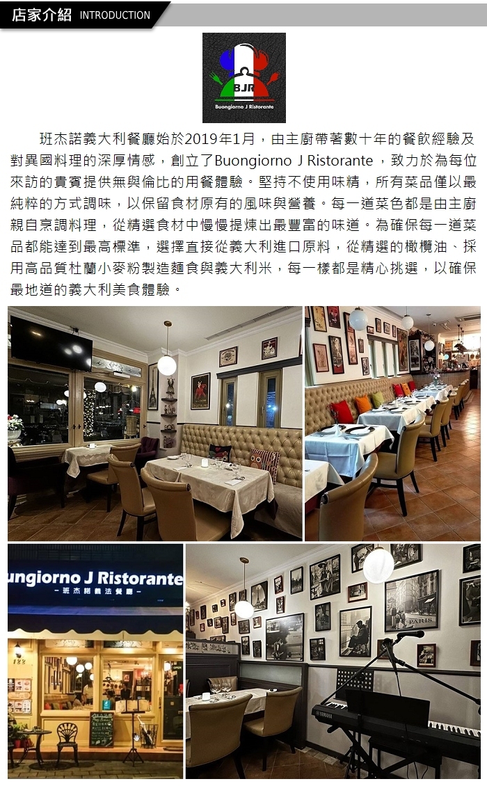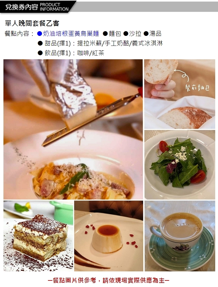 餐點內容:●奶油培根蛋黃鳥巢麵 ●麵包 ●沙拉 ●湯品 ●甜品(擇1):提拉米蘇/手工奶酪/義式冰淇淋 ●飲品(擇1):咖啡/紅茶 ★以上餐點內容可能因季節食材不同而有所調整,依現場供應為主。