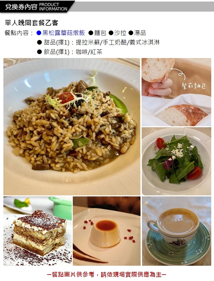 餐點內容:●黑松露蘑菇燉飯 ●麵包 ●沙拉 ●湯品 ●甜品(擇1):提拉米蘇/手工奶酪/義式冰淇淋 ●飲品(擇1):咖啡/紅茶 ★以上餐點內容可能因季節食材不同而有所調整,依現場供應為主。
