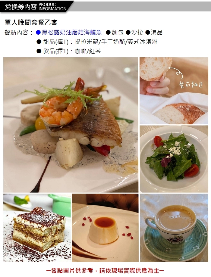 餐點內容:●黑松露奶油蘑菇海鱸魚 ●麵包 ●沙拉 ●湯品 ●甜品(擇1):提拉米蘇/手工奶酪/義式冰淇淋 ●飲品(擇1):咖啡/紅茶 ★以上餐點內容可能因季節食材不同而有所調整,依現場供應為主。