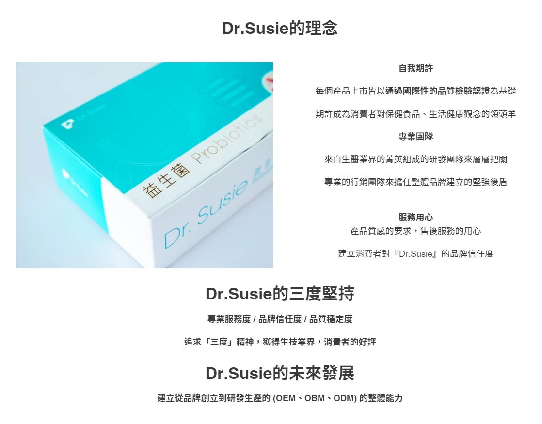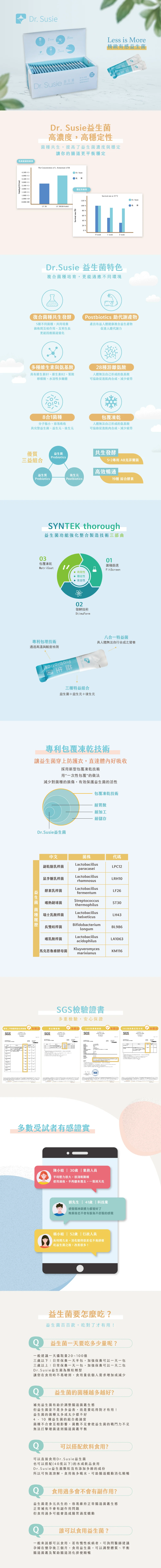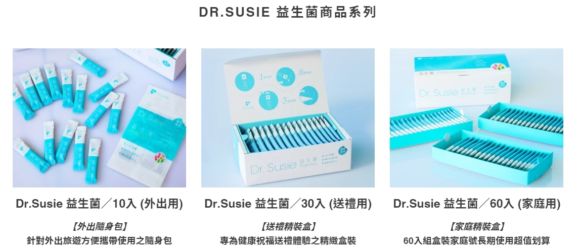 Dr.Susie 益生菌為8合1菌種 (精選有菌株編號的益生菌)改變腸道菌叢生態,維持腸胃道機能,調節生理機能,調整體質。