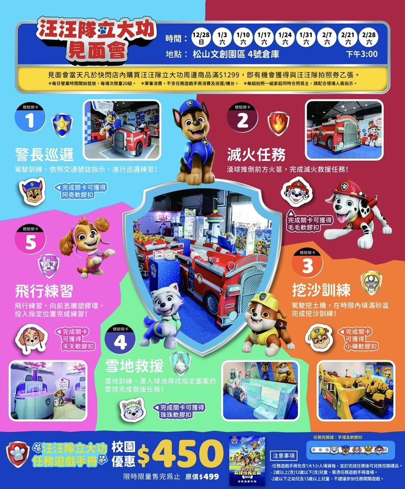汪汪隊見面會時間:12/28、1/3、1/10、1/17,1/24、1/31、2/7、2/21、2/28(圖片為高雄、台中展覽的照片)