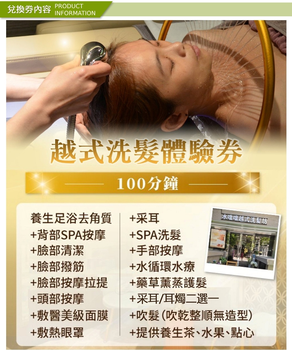 1.本券可1人至水噹噹越式洗髮坊體驗越式洗頭100分鐘。 內容:養生足浴去角質 + 背部SPA按摩 + 臉部清潔 + 臉部撥筋+ 臉部按摩拉提 + 頭部按摩 + 敷醫美級面膜 + 敷熱眼罩 + SPA洗髮 + 手部按摩 + 水循環水療 + 藥草薰蒸護髮 + 采耳/耳燭二選一 + 吹髮(吹乾整順無造型) + 提供養生茶、水果、點心,服務時間約為 100 分鐘。