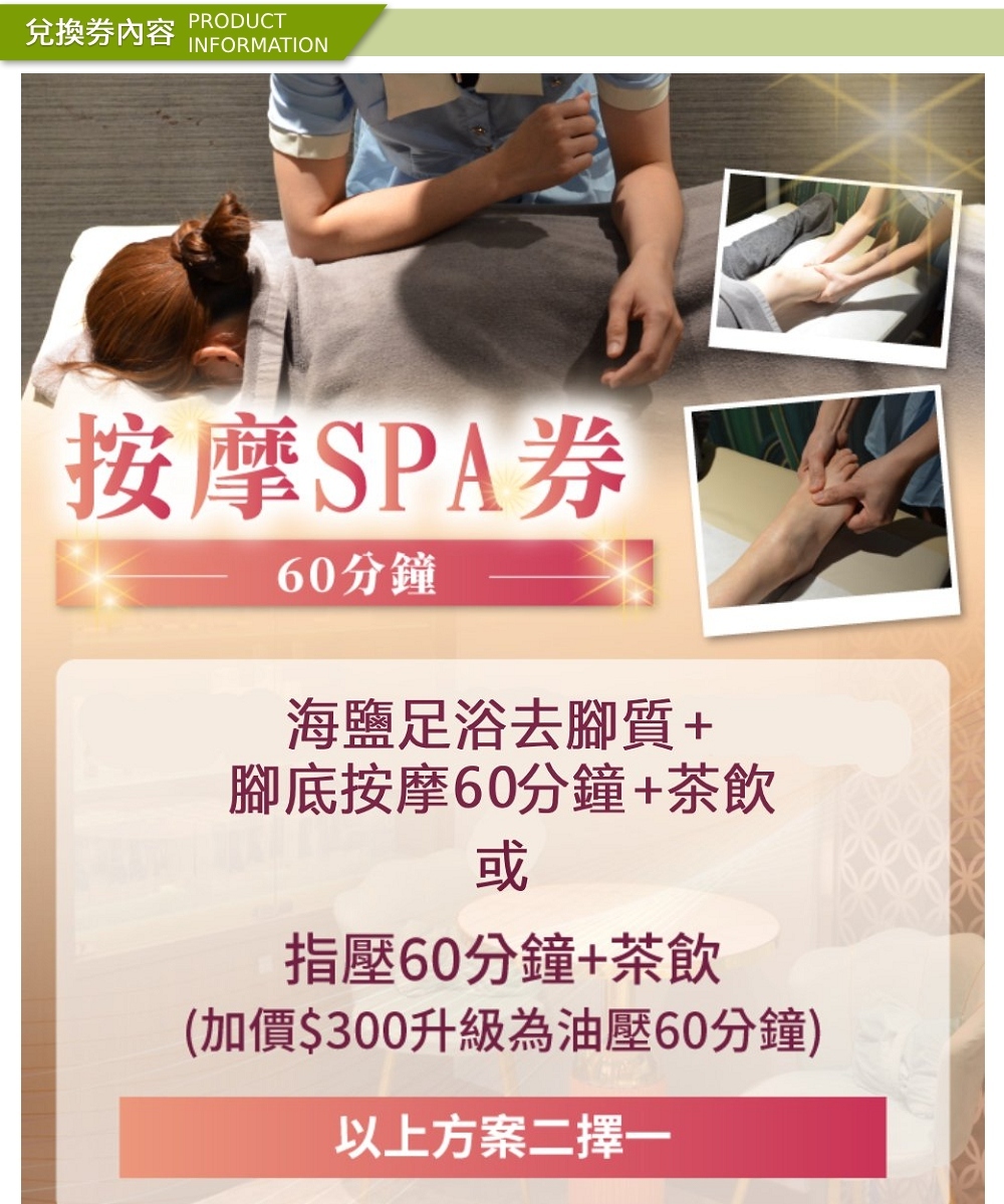 2.持券可於現場加價300元升級為油壓60分鐘。內容:油壓60分鐘+茶飲。